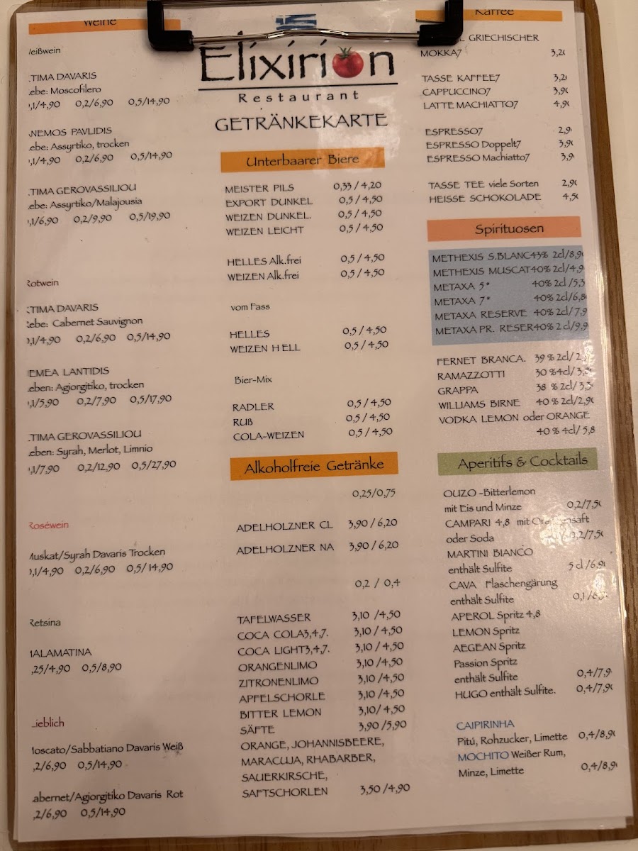 Restaurant Elixirion Menu